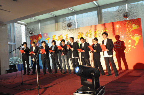 北京总部的全体员工,以及上海分公司、天津分公司及赞比亚合资公司SINOTRA的代表们和家属们聚集一堂,围绕“十年腾飞 激情盛伦”的主题,大家用自编自导自演的节目来表达自己喜悦的心情。在联欢会上,盛伦公司总经理马绍文向全体员工表示了新春的问候和祝福,揭开了联欢会文艺表演的序幕。这些精彩纷呈的节目,包括话剧、芭蕾舞表演、集体舞蹈、相声、电影配乐欣赏、诗朗诵、歌曲等多种形式。市场部的话剧《心路》浓缩了公司发展的不同阶段,通过“辛路、欣路、新路”三部分表现了公司逐渐做大做强的历程。现场部的相声《出差那点事》,用诙谐幽默的语言,生动的再现了工作中的苦与乐。